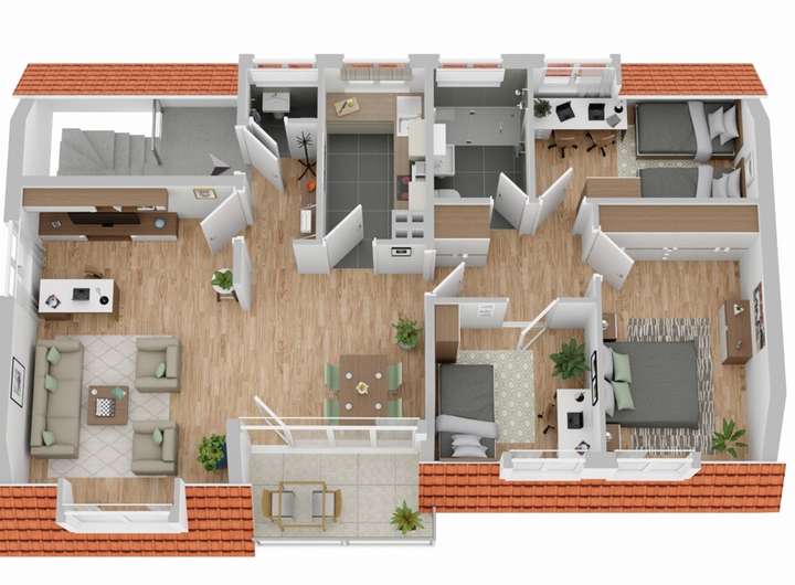 Die Dachgeschosswohnung ist identisch geschnitten und hat aufgrund von wenigen Dachschrägen ca. 89m² Wohnfläche. Ein Balkon (Südausrichtung) ist vorhanden. Außerdem ist der Dachboden von dieser Wohnung aus zugänglich und kann als zusätzliche Abstellfläche genutzt werden.