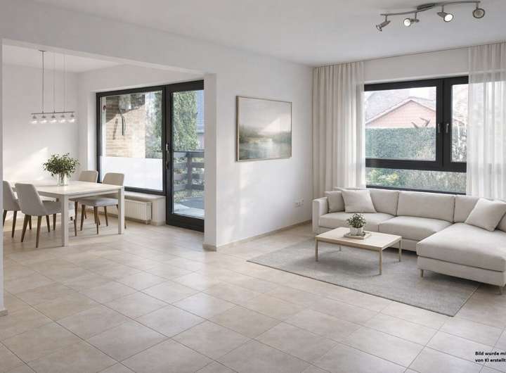 Die Erdgeschosswohnung mit ca. 92m² Wohnfläche bietet ein großzügiges, offen gestaltetes Wohnzimmer mit angrenzendem Essbereich und Zugang zu einer Terrasse (Südausrichtung) und schafft so eine einladende Wohnatmosphäre. Ergänzt wird der Grundriss durch eine separate Küche, ein Gäste-WC, ein Badezimmer (renoviert 90er Jahre) und drei individuell nutzbaren Zimmern z.B. Schlafzimmer, Kinderzimmer, Büro.