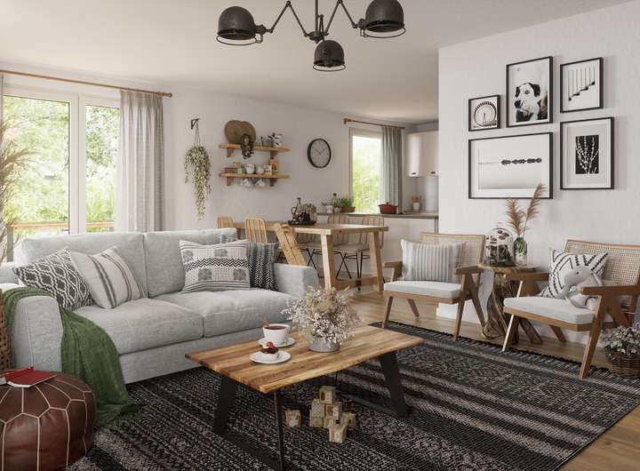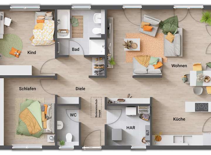 Der offen gestaltete Wohn-, Koch- und Essbereich ist das Zentrum des Familienlebens. Hier wird gemeinsam gekocht, gelacht und entspannt. Die bodentiefen Fenster lassen nicht nur viel Licht hinein, sondern ermöglichen auch vielfältige Zugänge zum Garten. Ob von der Küche oder vom Sofa aus, Ihre Wohlfühloase im Grünen ist stets nur ein paar Schritte entfernt. Besonders praktisch und platzsparend ist die integrierte Garderobe im Flur. Außerdem gibt es verschiedene Wohnbereiche, die auf Wunsch mit (Glas-)Türen abgetrennt werden können.