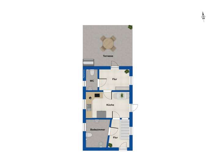 Hinter dem einladenden Windfang und dem gemeinschaftlichen Treppenhaus öffnet sich die Wohneinheit im Erdgeschoss. Hier stehen alle Zeichen auf Komfort: Das Herzstück bilden das großzügige Wohnzimmer sowie der angrenzende Essbereich mit direktem Zugang zur Küche. Ein helles Schlafzimmer bietet Ruhe und Rückzug. Das Badezimmer ist mit einer Dusche ausgestattet, ergänzt durch ein praktisches Gäste-WC. Ein besonderes Highlight ist die große, überdachte Terrasse: Sie erweitert den Wohnraum nach draußen und bietet einen herrlichen Blick in den großen Garten – ein Paradies für Kinder, Hobbygärtner und entspannte Grillabende.