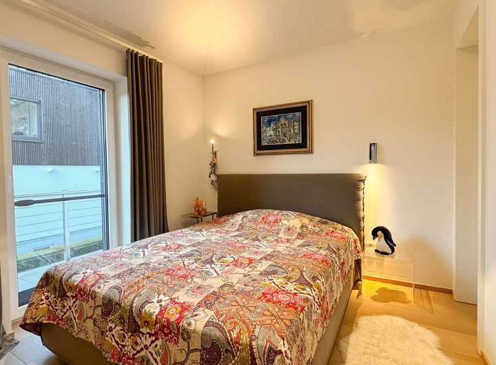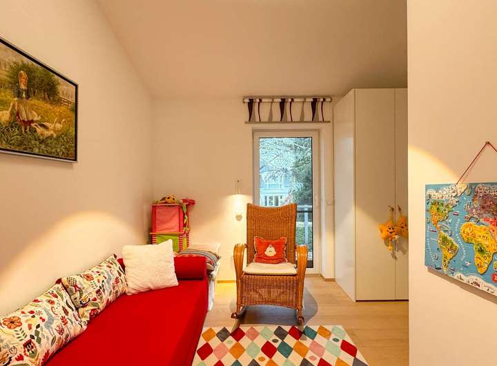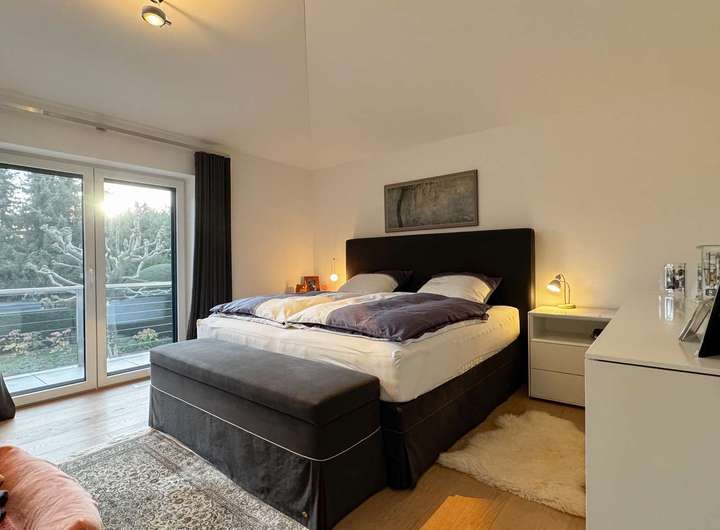 Hochwertiger Dielenboden sowie die maßgefertigte Einbauküche zeugen von der besonderen Qualität der Ausstattung. Praktische Einbauschränke dürfen natürlich auch nicht fehlen.
