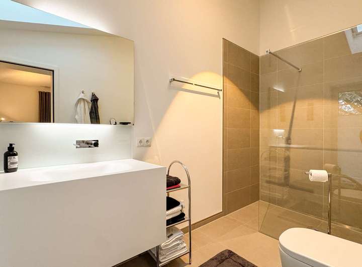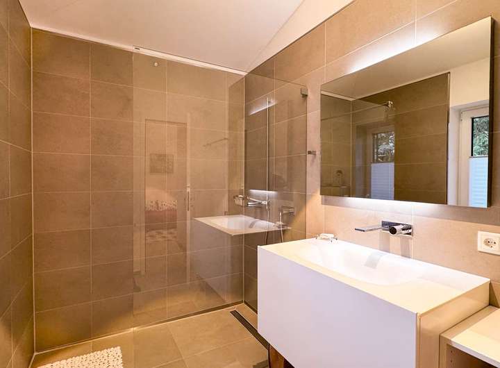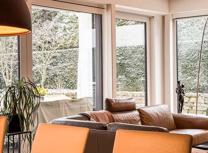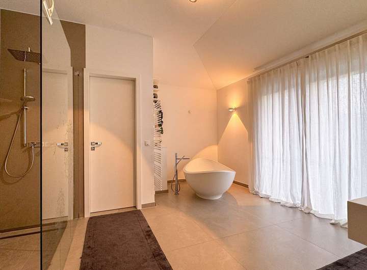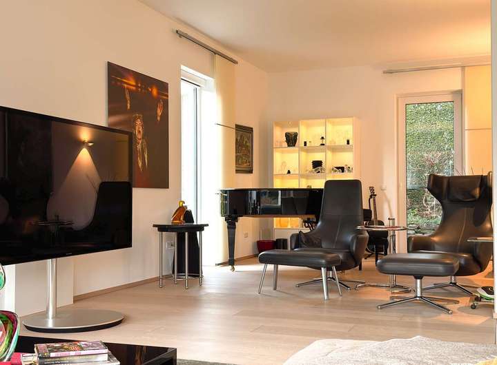 Musik, Licht, Beschattung und Elektrik lassen sich bequem und individuell per Knopfdruck regulieren. Dreifach verglaste raumhohe Fenster bieten in Verbindung mit elektrisch steuerbaren Raffstores ein Höchstmaß an Komfort und Sicherheit.