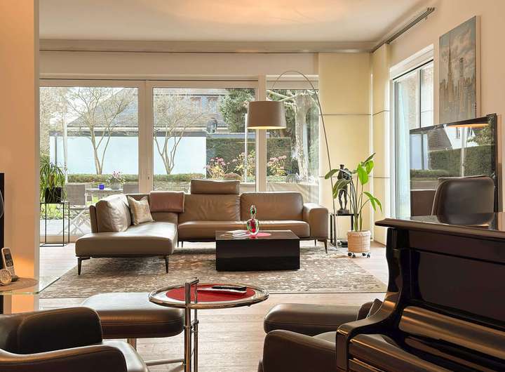 Großflächige Fenster in idealer Südwest-Ausrichtung sorgen für lichtdurchflutete Räume und schaffen aus nahezu jedem Bereich beeindruckende Blickachsen in den liebevoll angelegten Garten. Die bis zu drei Meter hohen Decken verstärken das Raumgefühl.