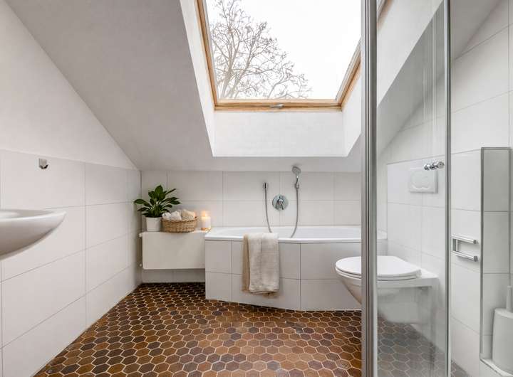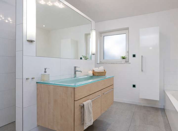 * Luxuriöses Tageslichtbad mit bodentiefer Dusche, stilvoller Badewanne und edlem Glaswaschtisch