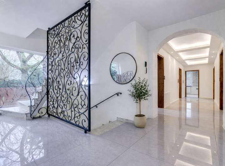 * Stilvoller Eingangsbereich mit indirekter Beleuchtung und großformatigen Designerfliesen