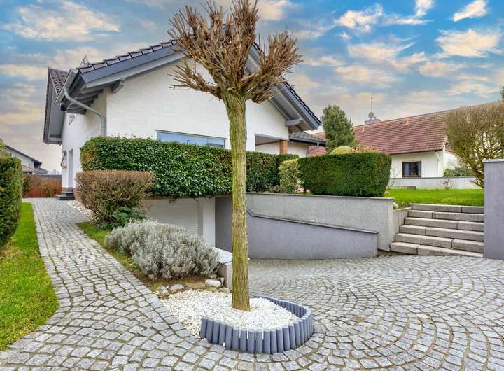 Auch die Außenanlage besticht durch eine stilvolle und repräsentative Gestaltung. Eine edle Garteneinfriedung sowie ein professionell angelegter Garten mit Granit-Pflaster verleihen dem Anwesen ein exklusives Ambiente. Die großzügige Südterrasse und der weitläufige XXL-Südbalkon bieten perfekte Rückzugsorte, um die Sonne zu genießen und entspannte Stunden im Freien zu verbringen.