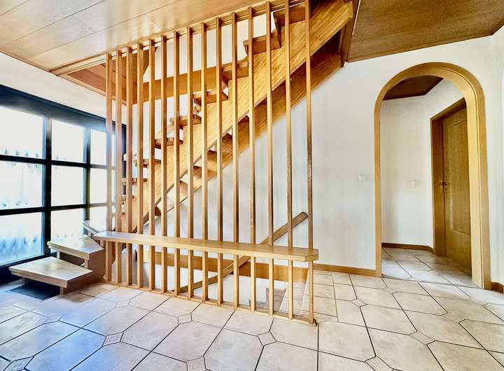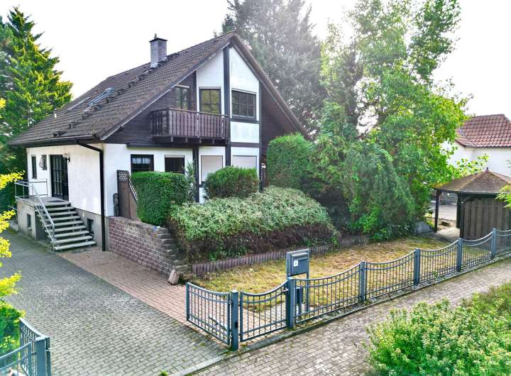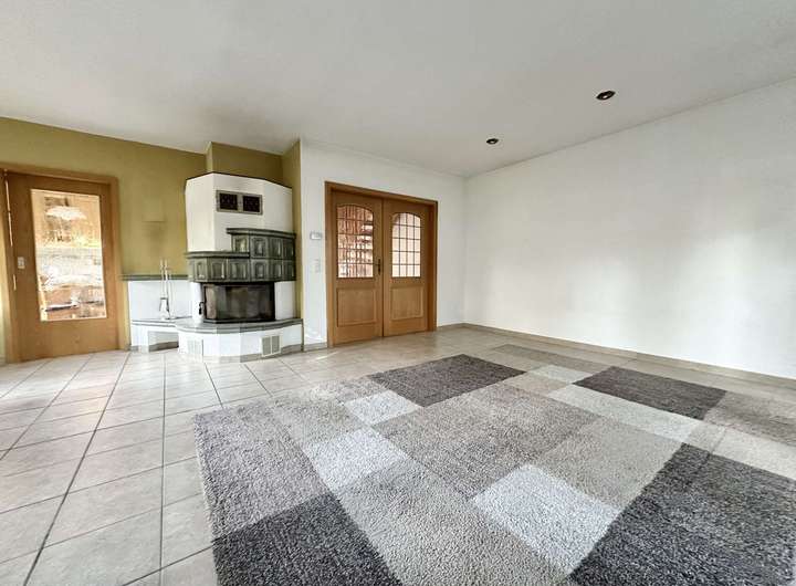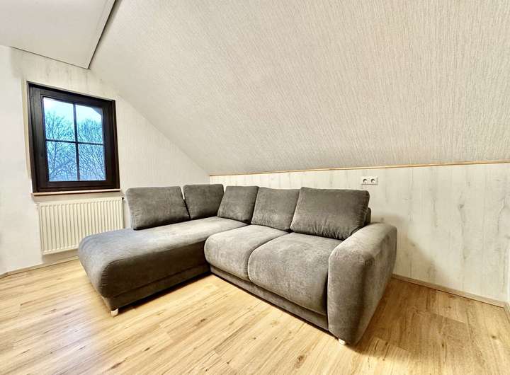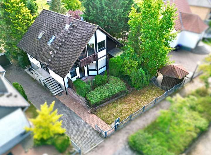 Auf einer Grundstücksfläche von 597 m² erstreckt sich eine Wohnfläche von insgesamt 207,79 m², welche sich auf das Hauptgebäude sowie eine separate Einliegerwohnung verteilt. Bereits beim Betreten der Immobilie vermittelt der großzügige Eingangsbereich mit offener Treppe ein Gefühl von Weite und Eleganz. Von hier aus gelangt man in die helle, einladende Küche, die über einen direkten Zugang zur umlaufenden Terrasse verfügt und sich als zentraler Treffpunkt für Familie und Gäste anbietet. Das angrenzende Wohnzimmer beeindruckt mit einer großzügigen, bodentiefen Fensterfront, die den Blick auf die umliegende Natur freigibt. Ein Kamin sorgt hier für eine behagliche Atmosphäre und unterstreicht den wohnlichen Charakter des Raumes. Ergänzt wird das Erdgeschoss durch ein Schlafzimmer, ein zeitgemäßes Badezimmer mit Dusche, ein separates WC sowie einen funktionalen Hauswirtschaftsraum.