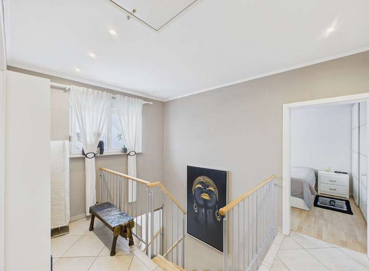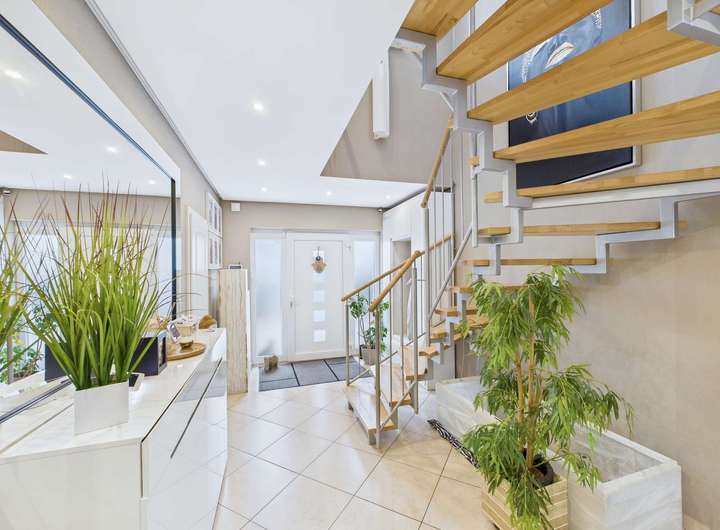 Sie öffnen die Haustür und befinden sich im großzügigen Eingangsbereich. Gleich links führt Sie die Treppe ins Obergeschoss zu den drei Schlafräumen und dem Masterbad. Auf der rechten Seite haben Sie das Gäste-WC. Links am Ende der Diele geht es in die Traumküche. Von dort aus können Sie sowohl den Wintergarten als auch das Wohnzimmer betreten. Der ca. 25qm große Wintergarten kann auch im Winter sehr gut genutzt werden. Die Glaselemente sind im Sommer aufschiebbar, so dass man mitten im Garten sitzt. Das Wohnzimmer mit Essbereich und gemütlicher Sitzgruppe vor dem Kamin ist der ideale Rückzugsort. Im Erdgeschoss befinden sich noch zwei weitere Räume, das Arbeitszimmer mit Blick in Richtung Straße und ein Hobbyraum oder Gästezimmer hinter der Garage mit direktem Zugang in den Garten.