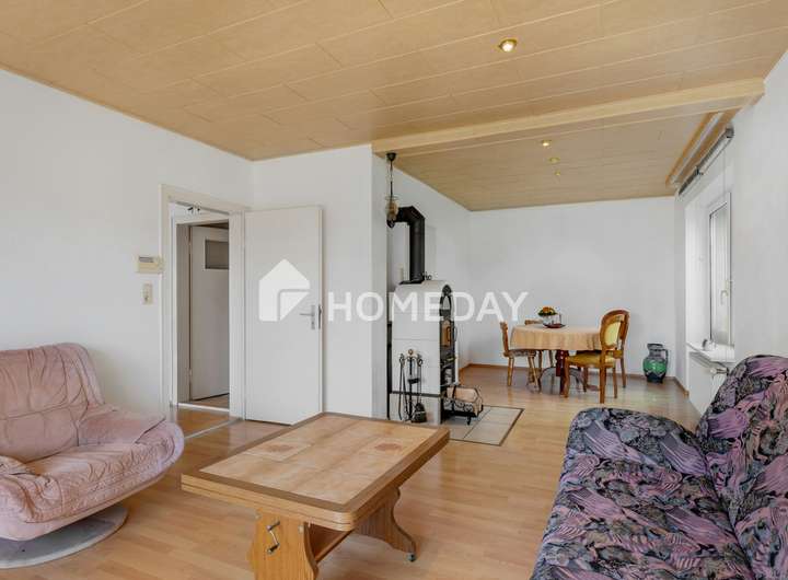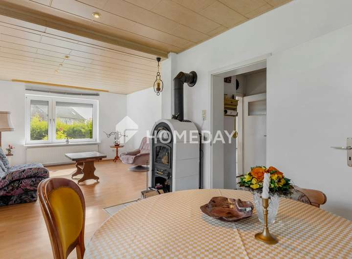 Im Erdgeschoss empfängt Sie ein geräumiger Flur mit Zugang zu allen Räumen. Das großzügige Wohnzimmer mit Kaminofen bildet das Herzstück des Hauses und bietet ausreichend Platz für einen separaten Essbereich. Die funktionale Einbauküche, ein Tageslichtbad mit Badewanne, ein Abstellraum sowie ein vielseitig nutzbares Zimmer mit direktem Zugang zur Garage ergänzen diese Ebene auf praktische Weise.