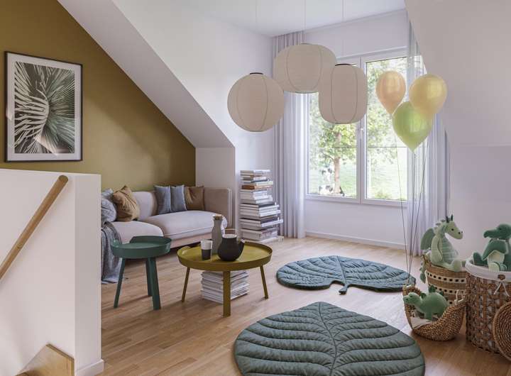 Minimalismus trifft auf Eigenheimtraum: Auf über 130 Quadratmetern kannst du dich voll hausleben. Dieses Fertighaus, das nach deinen Wünschen und Vorstellungen projektiert wird, bietet dir im Erdgeschoss einen offenen Wohn- und Essbereich mit einer modernen Kücheninsel, die perfekt in den Raum integriert ist. Zudem findest du hier ein Arbeitszimmer, eine praktische Garderobe und ein Gäste-WC, die den Alltag erleichtern. In der oberen Etage befinden sich zwei Schlafzimmer, darunter ein beeindruckendes Hauptschlafzimmer mit großzügiger Ankleide, sowie ein kinderfreundliches Zimmer. Die Galerie bietet dir zusätzlichen Platz, den du flexibel nutzen kannst, sei es als Leseecke oder Spielraum für die Kinder.
