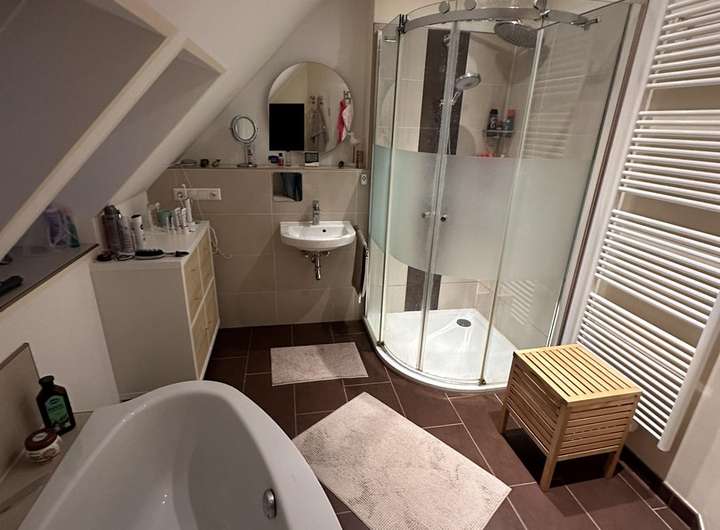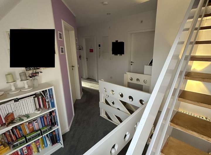 Über eine geschlossene Holztreppe gelangt man ins Obergeschoss. Hier befinden sich weitere 4 Räume. Ein Schlafraum ist mit einem separat zugänglichen WC und Einbauschrank ausgestattet. Im Obergeschoss befinden sich ein Dusch- und Wannenbad sowie ein weiteres WC mit Waschtisch.