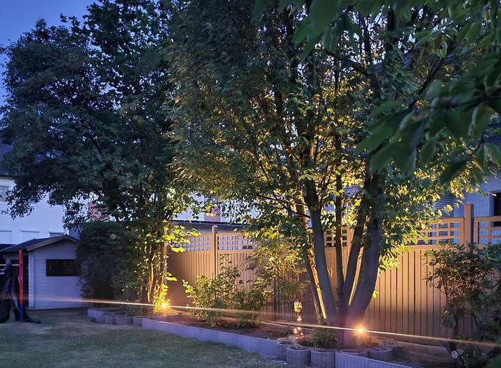 Der Garten ist allseitig mit Zäunen eingegrenzt und pflegleicht angelegt. Für Kleintierliebhaber gibt es einen Stall mit Innen- und Außenbereich (derzeit Kaninchengehege). Weiterhin befinden sich im Garten noch Unterstellbereiche (z.B. für Wäsche), ein Geräteschuppen, ein Spielhaus und eine Aufstellfläche für einen Pool (4x4m). Auf dem Geräteschuppen wurde 2025 ein Balkonkraftwerk mit Südausrichtung installiert.