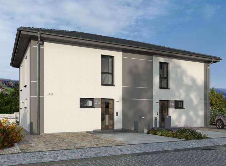 Durch seine Größe, das elegante Walmdach und die großen Fensterfronten wirkt unser Doppelhaus 11 herrschaftlich und imposant. Erst auf den zweiten Blick ist erkennbar, dass es sich um zwei getrennte Wohneinheiten handelt, in denen den künftigen Hausherren jeweils rund 142 m² Wohnraum zur Verfügung stehen. Im Erdgeschoss bietet das große Wohn-Ess-Zimmer mit sich direkt anschließender Küche ausreichend Raum für gemütliche TV-Abende, aber auch, um Gäste zu empfangen. Von hier aus ist auch der Zugang zur Terrasse bzw. zum Garten möglich. Große Fensterfronten sorgen für ausreichend Lichteinfall. Abgerundet wird das Raumangebot im Erdgeschoss durch einen Hauswirtschaftsraum, Gäste-WC und eine große Diele mit Garderobe. Von hier aus führt der Weg ins Obergeschoss, wo insgesamt drei Schlafräume zur Verfügung stehen. Ein Bereich für die Eltern sowie zwei Kinderzimmer. Highlight ist das mehr als 13 m² große Badezimmer, das mit Wanne, Dusche und WC einer Wohlfühloase gleicht.
