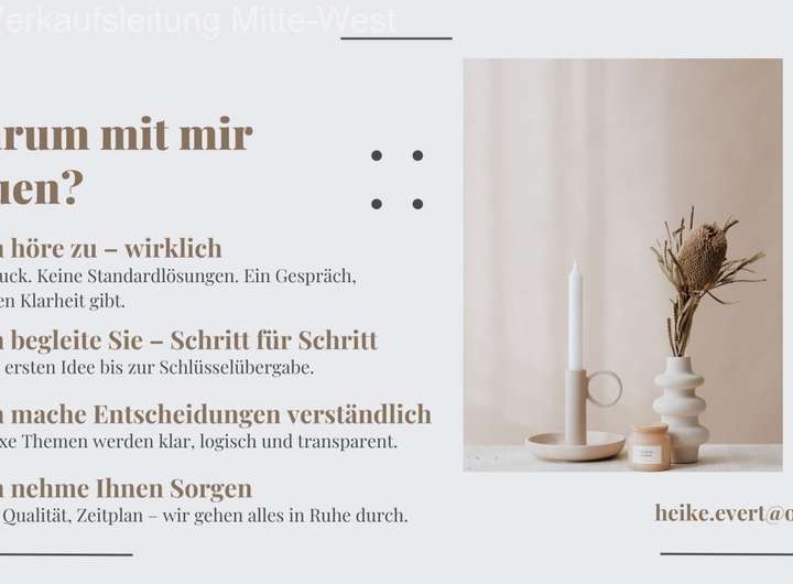 Interessiert? Dann freue ich mich auf Ihre Kontaktaufnahme unter Angabe Ihres Namens, Anschrift und Kontaktmöglichkeit über das Immo-Portal oder direkt per Email: heike.evert@okal.de.