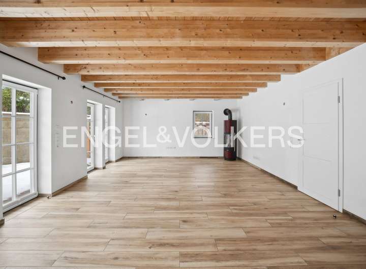 Eine Fußbodenheizung im gesamten Haus, betrieben über die effiziente Sole-Wärmepumpe, sorgt für ein besonders angenehmes Wohngefühl. Großformatige Fliesen in Holzoptik im Erdgeschoss und in Teilen des Dachgeschosses verbinden die warme Ausstrahlung von Holz mit den praktischen Vorteilen moderner Materialien. Die Wohn- und Schlafräume im Dachgeschoss sowie der wohnlich ausgebaute Spitzboden sind mit hochwertigem Laminat ausgestattet und schaffen eine behagliche Atmosphäre. Ein moderner Kaminofen im Wohnbereich setzt zusätzlich einen stimmungsvollen Mittelpunkt und sorgt für gemütliche Stunden.