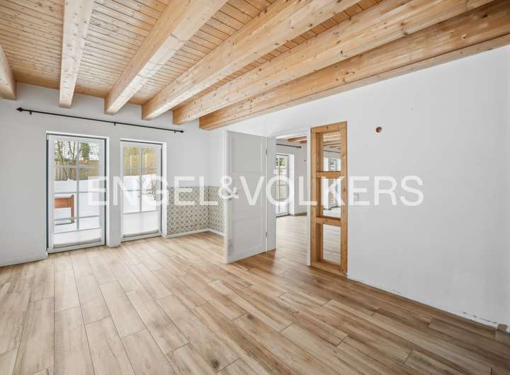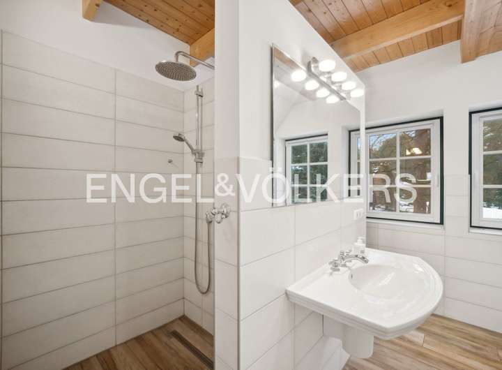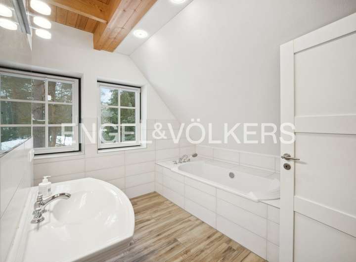 Die dreifach verglasten Holz-Sprossenfenster und die stilvolle Eingangstür fügen sich harmonisch in das architektonische Gesamtkonzept ein und unterstreichen den hochwertigen Charakter der Immobilie.