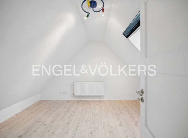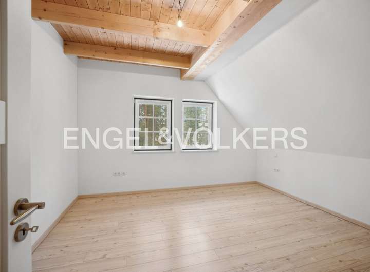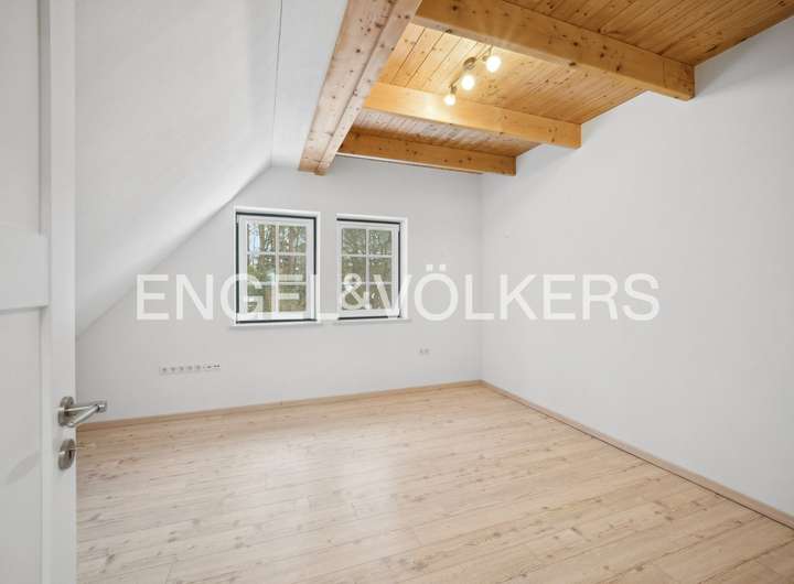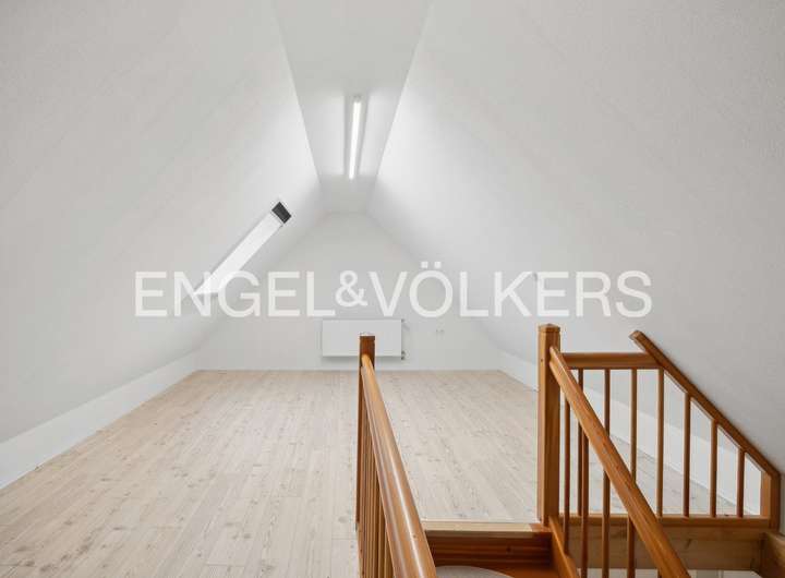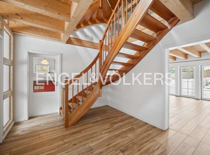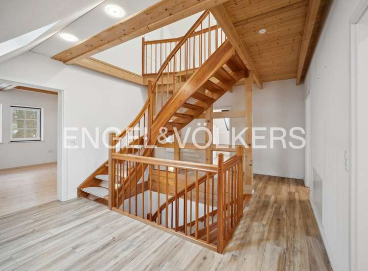 Im Inneren überzeugt das Haus durch eine großzügige, durchdachte und familien-freundliche Raumaufteilung. Erdgeschoss, Dachgeschoss und der wohnlich ausgebaute Spitzboden bieten vielfältige Nutzungsmöglichkeiten – sei es für die Familie, für Gäste, ein Homeoffice oder kreative Rückzugsorte. Die Ebenen sind über eine stilvolle Treppe aus Lärchenholz miteinander verbunden, die den natürlichen und hochwertigen Charakter des Hauses unterstreicht.