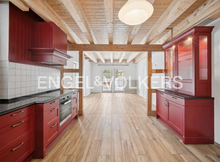Die großzügige Küche ist mit einer hochwertigen Echtholz-Einbauküche der Marke Häcker ausgestattet und verfügt über eine elegante Granitarbeitsplatte, die Funktionalität und Ästhetik harmonisch verbindet. Das Gästebad im Erdgeschoss mit Dusche präsentiert sich klassisch und zeitlos, während das Hauptbad im Obergeschoss mit Badewanne und separater Dusche einen komfortablen Ort der Entspannung bietet.