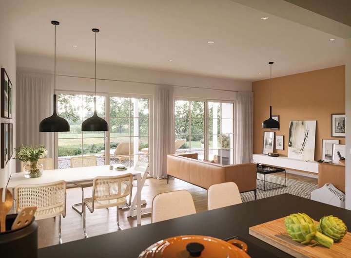 Der Entwurf "AMBIENCE 130". Mit den holzfarbenen Fensterrahmen, dem angebauten Carport und der Dachabschleppung, die sich schützend über die Terrasse legt, greift er spielerisch Elemente der klassischen Bauweise auf. Den modernen Wohnansprüchen folgend, lässt sich die gesamte Gartenseite mit großformatigen Fenstern ausstatten. Filigrane Sprossen betonen dabei den ländlichen Charakter des Fertighauses.