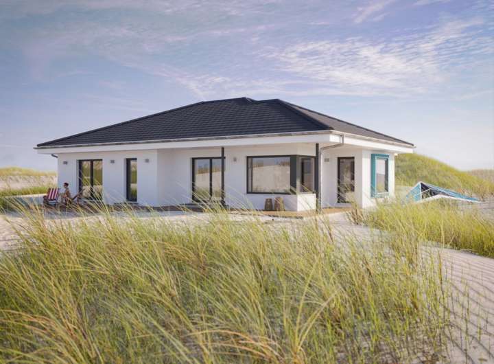 Im Innern des Bungalows wird Wohnkomfort großgeschrieben. Das zeigt sich bereits am Eingangsbereich: Empfangen werden die Bewohner und Besucher von einer repräsentativen Diele, in der sich auch mehrere Personen gleichzeitig aufhalten können, ohne sich dabei auf die Füße zu treten. Da keine Treppe integriert werden muss, kann der Platz stattdessen für schöne Garderobenmöbel und einen großen Schuhschrank genutzt werden. Links gelangt man in den weitläufigen Wohn-, Ess- und Kochbereich, der viel Raum für eigene Gestaltungsideen lässt. Wie wäre es beispielsweise mit einer langen Theke, die zu einem netten Plausch bei Kaffee und Kuchen einlädt? Oder eine gemütliche Eckcouch, auf der man zusammen mit seinen Lieben die neuesten Serien schauen kann? In der rechten Gebäudehälfte befinden sich die privaten Ruhe- und Erholungsräume der Bewohner. Den Eltern wird ein luxuriöser Wohlfühlbereich aus Schlafzimmer, Ankleide und Bad en suite zur Verfügung gestellt. Der Nachwuchs kann sich über ein gut geschnittenes Kinderzimmer und ein separates Bad mit Dusche freuen. Ergänzt wird das Raumangebot von einem Technikraum sowie einem Abstellraum für Staubsauger und Co. Wird mehr Stauraum benötigt, dann kann der Bungalow auch unterkellert werden.