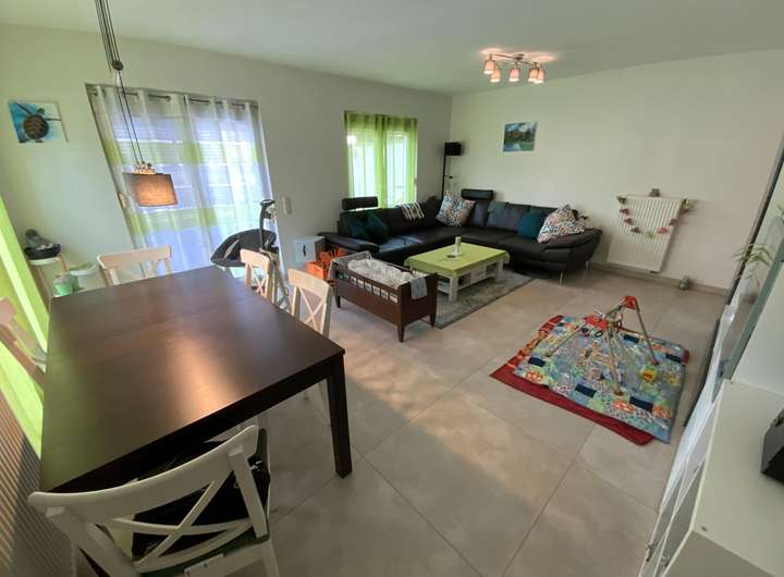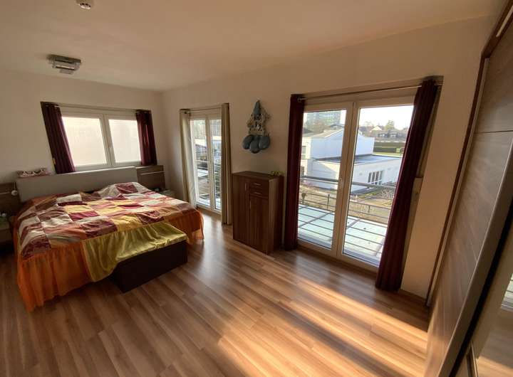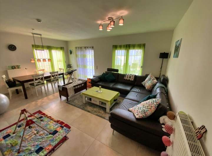 Die Wohnfläche beläuft sich auf ca. 136 m². Im Erdgeschoss befindet sich ein helles Wohnzimmer mit Zugang auf die Terrasse und zum Garten, eine geräumige Küche und ein Gäste-WC. Durch die bodentiefen Fenster sind alle Räume schön lichtdurchflutet.