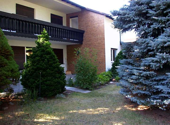 Einfamilienhaus mit großem Balkon und Terrasse mit Blick auf den Garten.