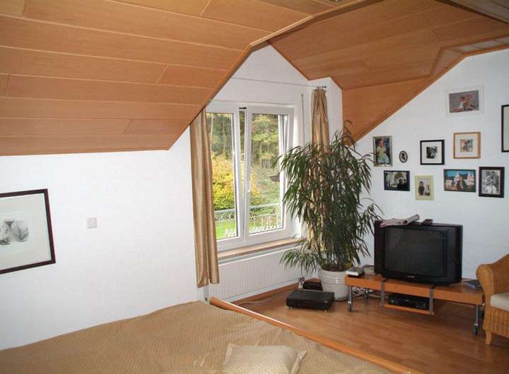 DG: gr. Schlafzimmer mit begehb. Kleiderschrank; gr. hellgefliestes Bad mit Wanne, verglaster Dusche und WC, 2 Waschbecken, excl. Badmöbel mit großem Spiegel; 2 Kinderzimmer; alle Decken echtholzvertäfelt