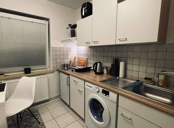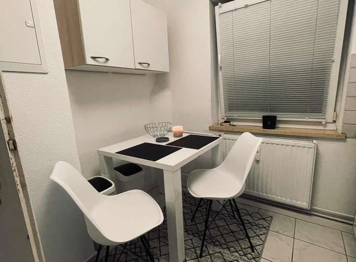 Das sehr helle, ruhige Apartment ist mit Laminat- und Fliesen belegt. Die Küche ist ein abgeschlossener Raum, in dem auch noch ein kl. Esstisch Platz findet.