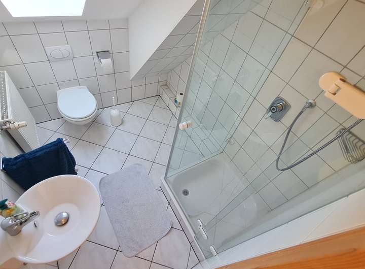 Apartment mit kleinem Bad (WC, Dusche, Waschbecken).