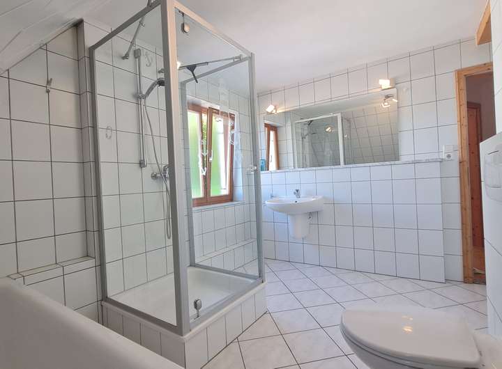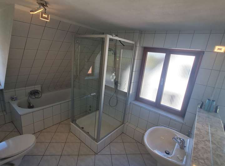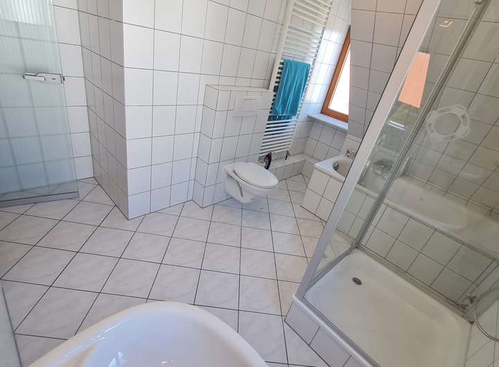 3 Zimmer, und großes Bad mit Waschbecken, Badewanne in Überlänge und separater Dusche.