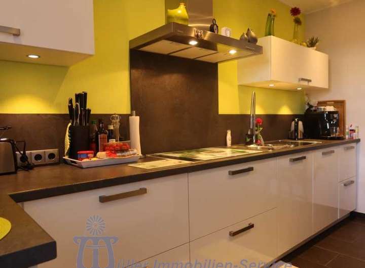 Eine hochwertige moderne Einbauküche mit weißen Fronten und Edelstahl-Abzugshaube wurde im Jahr 2018 eingebaut.