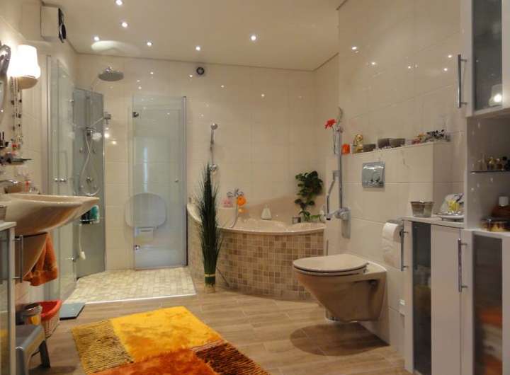 - weiße Holzdecke mit Einbauleuchten im exklusiven Bad des EG