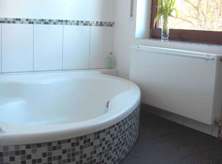 2007 neu eingebautes Bad mit Fußbodenheizung, Eckbadewanne, Bidet, DU, Waschtisch, WC.