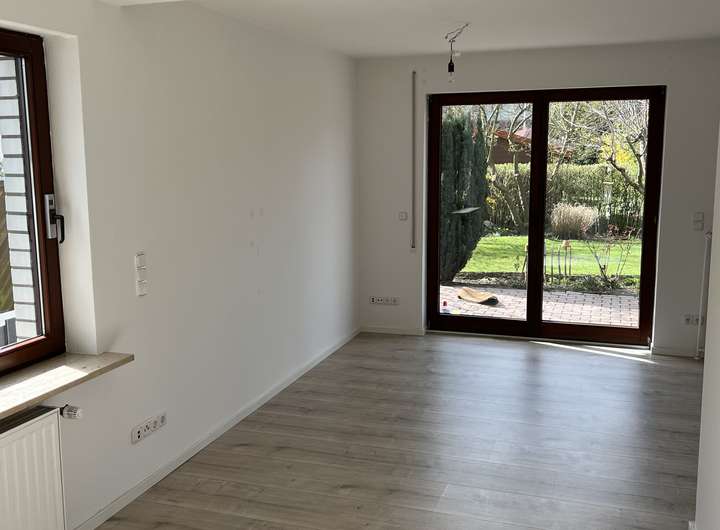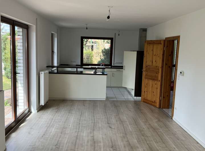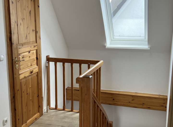 Wohnzimmer, offene Küche, 1/2 Zimmer und Gäste-WC im Erdgeschoss. 3 Zimmer, Badezimmer und Duschbad im Dachgeschoss und zu 3/4 unterkellert mit gefliester Waschküche und gefliestem Flurbereich.