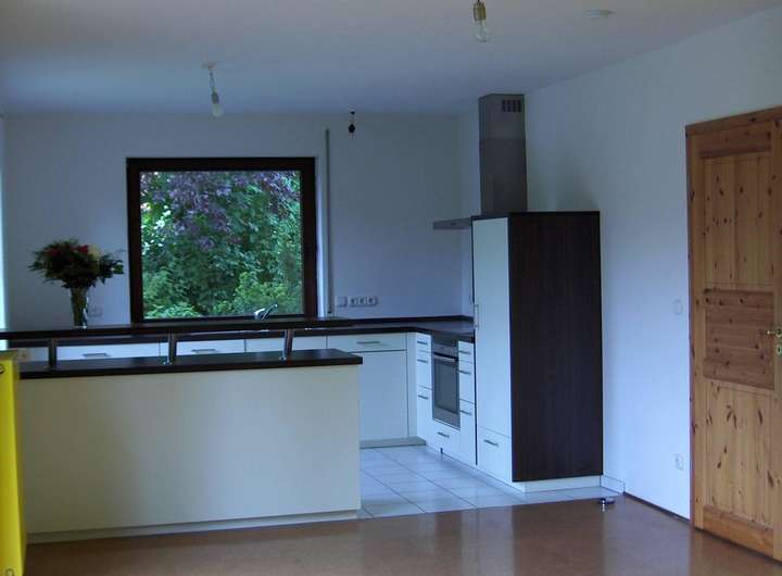 helle Einbauküche von 2007, offen zum Wohnbereich, Ceranfeld, Umluftbackofen, Edelstahl-Dunstabzugshaube, Küchen-Tresen.