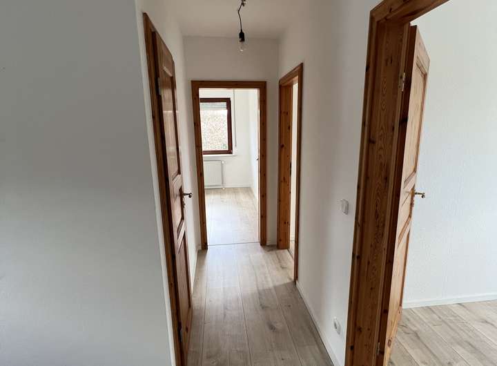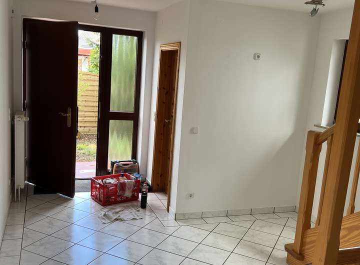 geflieste Eingangsdiele, Holztüren Kiefer gewachst, helles Laminat in Holzoptik.