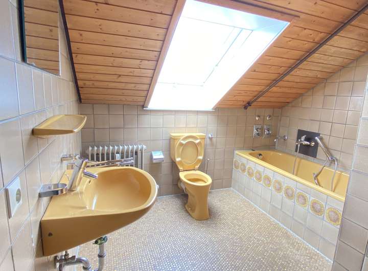 - Tageslichtbad mit Badewanne, Waschbecken, WC und Waschmaschinenanschluss