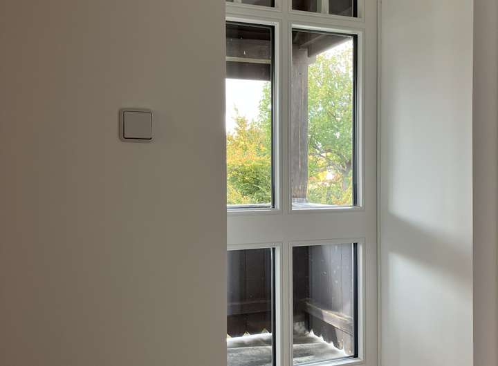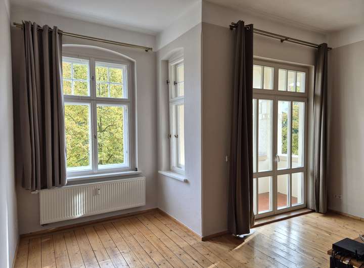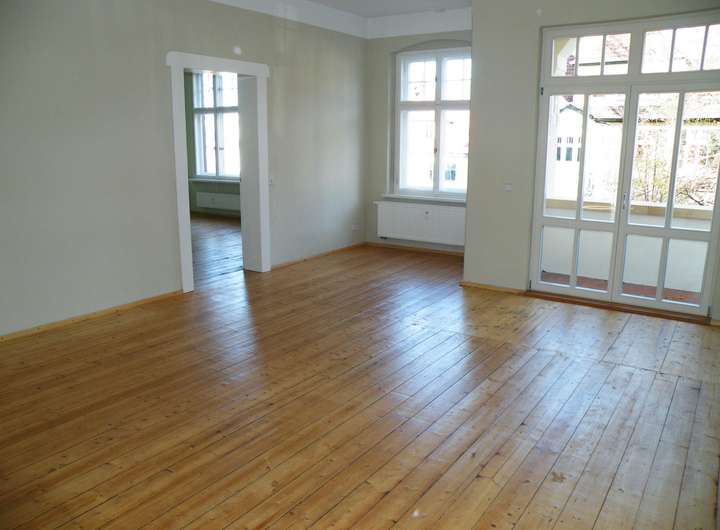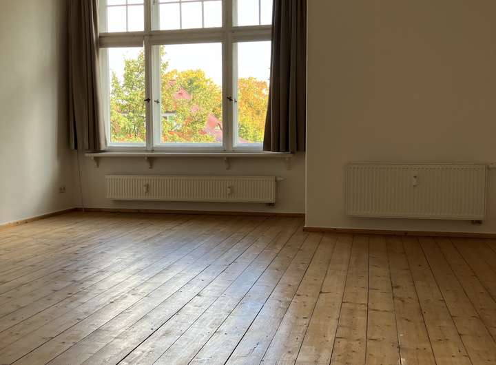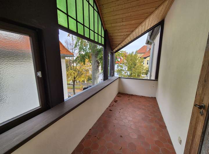 Die helle und großzügige Wohnung umfasst das gesamte 1. Obergeschoss. Ein Balkon (ca. 4 m²) ist nach Osten und der andere (ca. 2 m²) nach Westen orientiert. Zusätzlich kann auf Wunsch eine ca. 8m² große Terrasse auf der gleichen Etage vermietet werden. Gartennutzung ist nach Vereinbarung möglich.