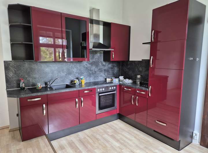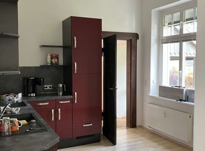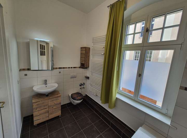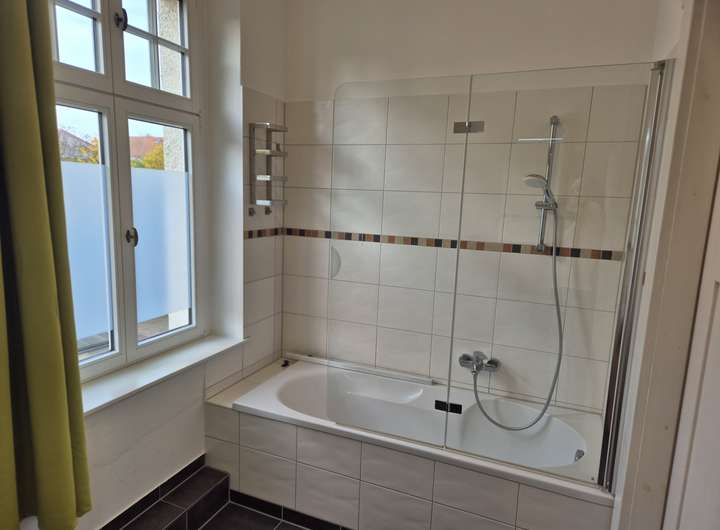Das Bad (mit Fenster) ist mit Badewanne+Dusche sowie Handtuchheizkörper ausgestattet. Die Einbauküche (mit Geschirrspüler, Kühlschrank, TK-Einheit) wird mit 25 EUR/Monat gesondert berechnet. Der Waschmaschinen- und Trocknerstellplatz im Keller. Bei der Sanierung wurden keine künstlichen Materialien verwendet; Wände weiß/pastell gestrichen. Fußböden: gesamte Wohnung Weichholzdielen farblos lackiert (außer Küche: Laminat, Bad: Fliesen).