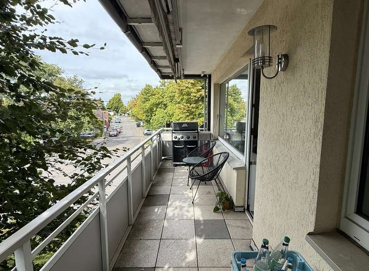 In Westlage befindet sich ein überdachter Balkon, der vom Wohnzimmer zu begehen ist.