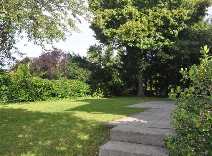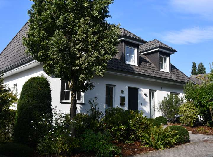 Der Garten mit seiner nach Südwesten ausgerichteten Terrasse bietet sich zum Verweilen an und kann auf ganzer Hausbreite mit einer elektrischen Markise beschattet werden.