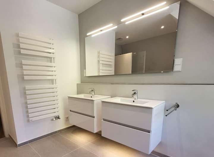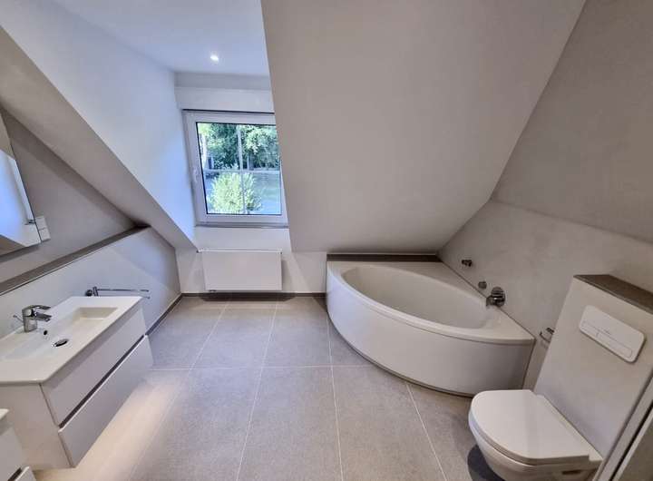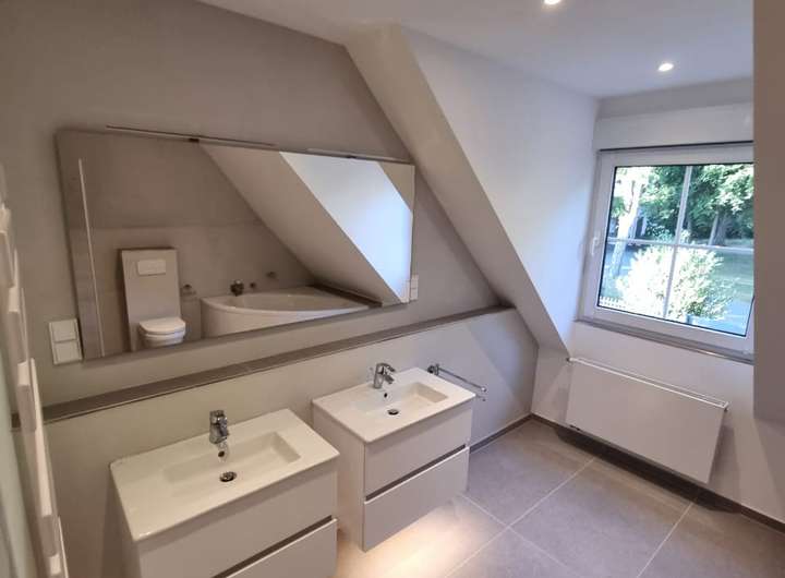 Das Obergeschoss überzeugt mit einem großzügigen Elternschlafzimmer, das direkten Zugang zu einem eleganten Ensuite-Bad bietet. Dieses wurde im August 2025 umfassend modernisiert und verfügt über eine Badewanne, eine separate Dusche, zwei stilvolle Waschbecken sowie einer Toilette. Drei weitere gut geschnittene Schlafzimmer und ein zweites modernisiertes Badezimmer mit hochwertiger Ausstattung runden diese Etage ab. Alle Schlafräume besitzen weiße Einbauschränke. Vom Obergeschoss gelangt man auch zum Dachboden, der viel zusätzlichen Stauraum bietet.