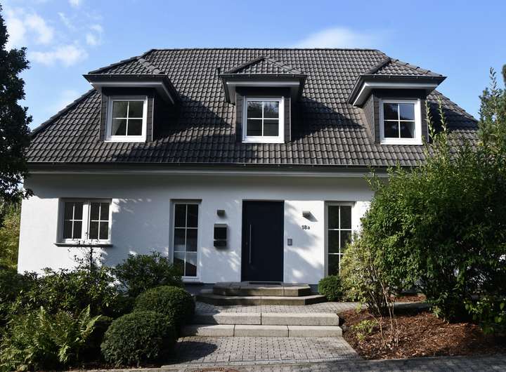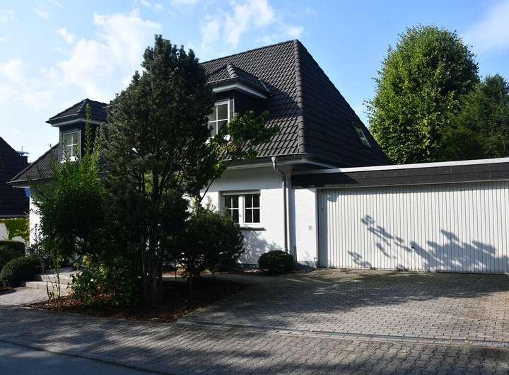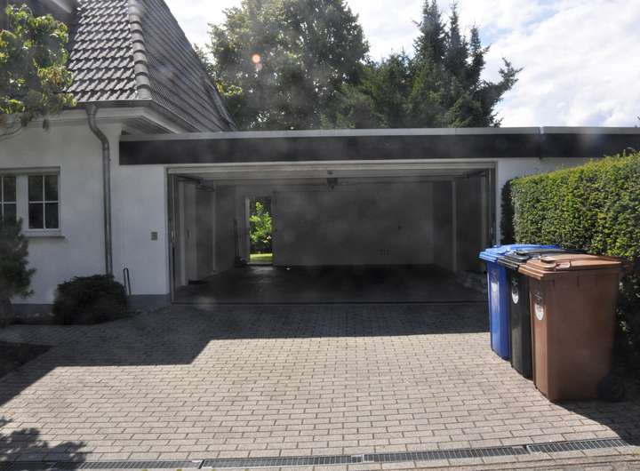 Auf der Eingangsseite des Hauses befindet sich die große Doppelgarage mit direkten Zugang zur Küche. Es sind ebenfalls noch zwei weitere Stellplätze vor der Garage vorhanden.