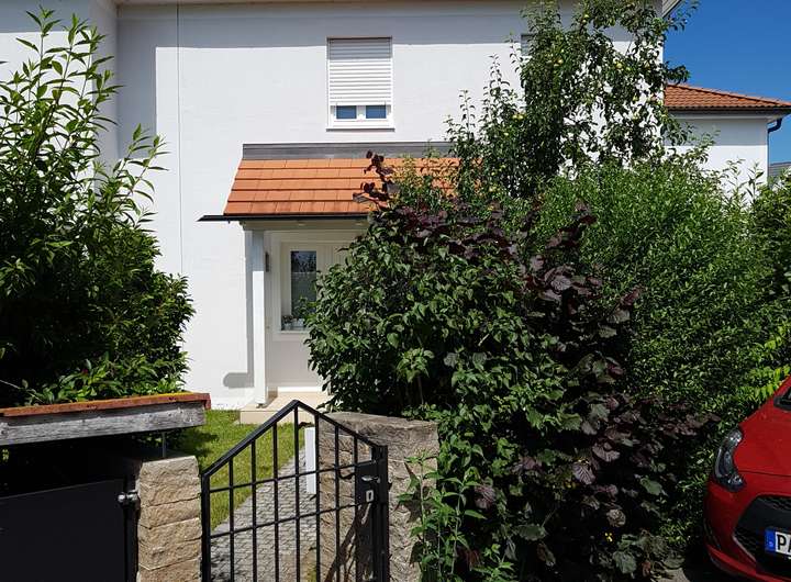 Aufgrund der Ausrichtung wird das Haus von 3 Seiten mit Licht durchflutet. Die mit einer kleinen Natursteinmauer umrandete Terrasse (14,48 qm) wird von der Ostseite des Hauses mit Sonne versorgt. Der kleine Garten bekommt Wärme und Sonne von Süden. Das Hausensemble von zwei Doppelhäusern im rechten Winkel zueinander und dessen Gartenanlage vermitteln einen südländischen Wohnflair gehobener Art mit bewachsenen Zäunen zur Straße hin.