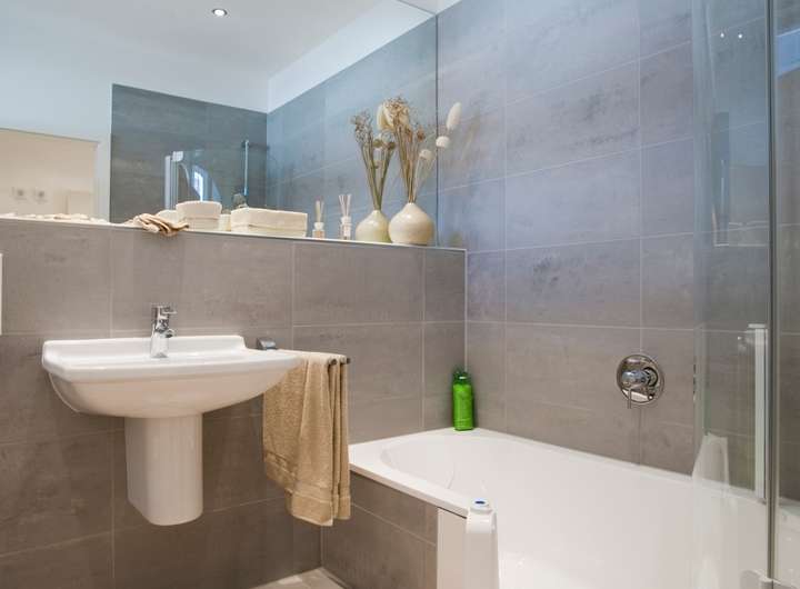 Feinsteinzeugfliesen in allen Nassbereichen und im Abstellraum