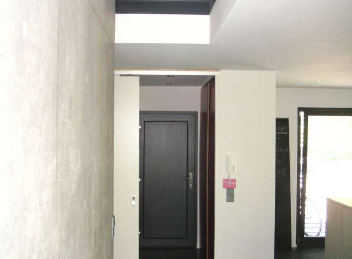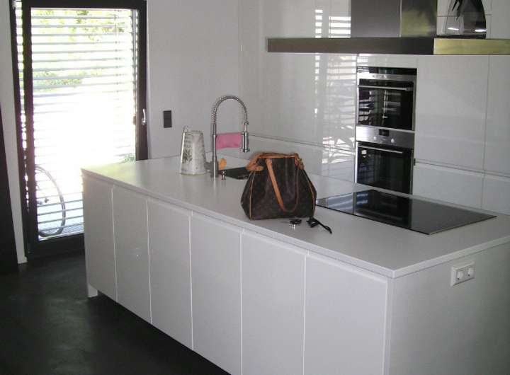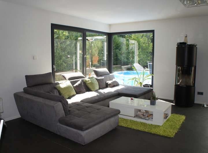 Im EG wurde ein dunkler Fliessestrich verlegt, im OG hochwertiger Echtholzparkett. Die Sichtbetontreppen sowie die Sichtbetonwand zur Galerie hin sind ein stilistisches Highlight des Hauses. Das ganze Haus ist mit einer Fussbodenheizung ausgestattet, die sich individuell regulieren lässt. Ein moderner Kamin sorgt für die eine wohnliche Atmosphäre. Die edle, vollwertig ausgestattete Einbauküche (mit Induktionsherd, Backofen und separatem Dampfgarer) lässt keinen Wunsch offen. Zum Haus gehört eine Garage sowie ein Stellplatz vor dem Haus.