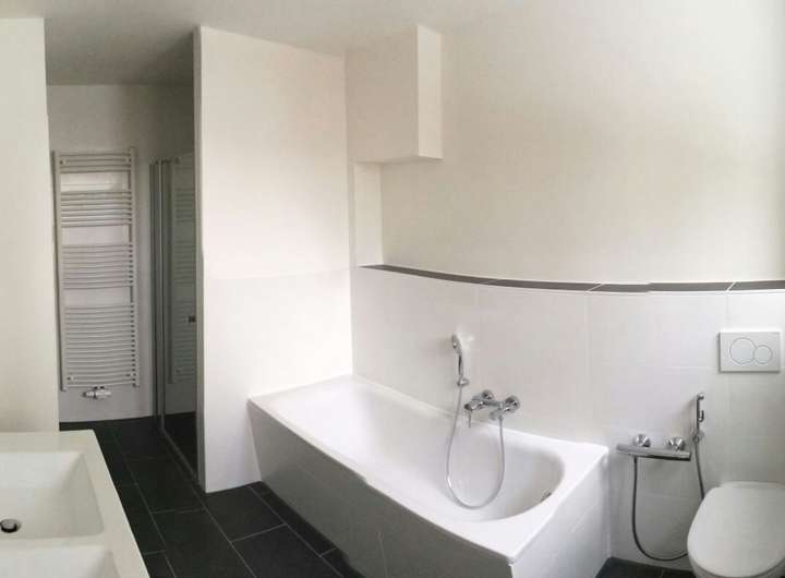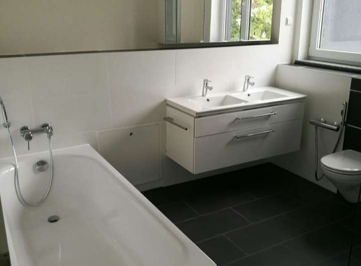 - Bäder mit großem Doppelwaschtisch und Spiegelschrank, Dusche, Badewanne, WC mit BD-Brause, Handtuchheizkörper