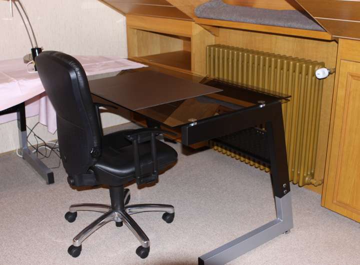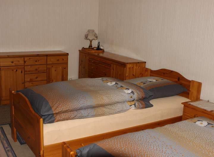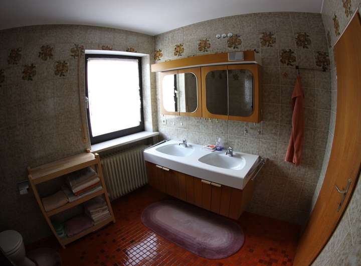 Im 1. OG befinden sich ein Bad mit Fenster, 2 Waschbecken, Badewanne und Dusche, ein Schlafzimmer mit Doppelbett und Zugang zum (Süd-)Balkon, ein Gästezimmer mit Einzelbett und Schreibtisch und ein weiteres komplett eingerichtetes Gästezimmer mit Bett.