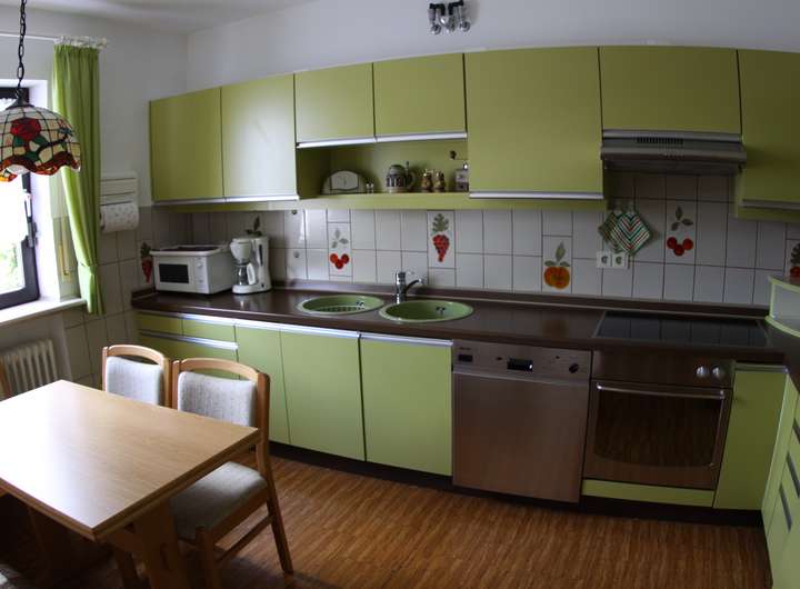 Im EG befinden sich ein großes Wohn-Eßzimmer mit Zugang zur Terrasse und schönem, eingewachsenem Garten, eine Einbauküche mit Eßplatz und Markengeräten, neues Kochgeschirr etc., Geschirrspülmaschine und Mikrowelle und ein Gäste-WC.