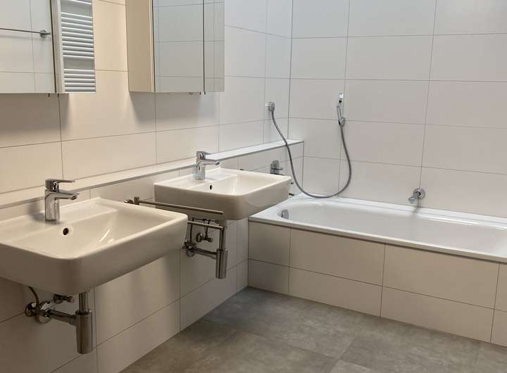 Im ersten Obergeschoss stehen zwei Zimmer zur Verfügung, die jeweils über einen eigenen Balkon verfügen. Ergänzt wird diese Etage durch ein komfortables Badezimmer mit Badewanne und Dusche.
